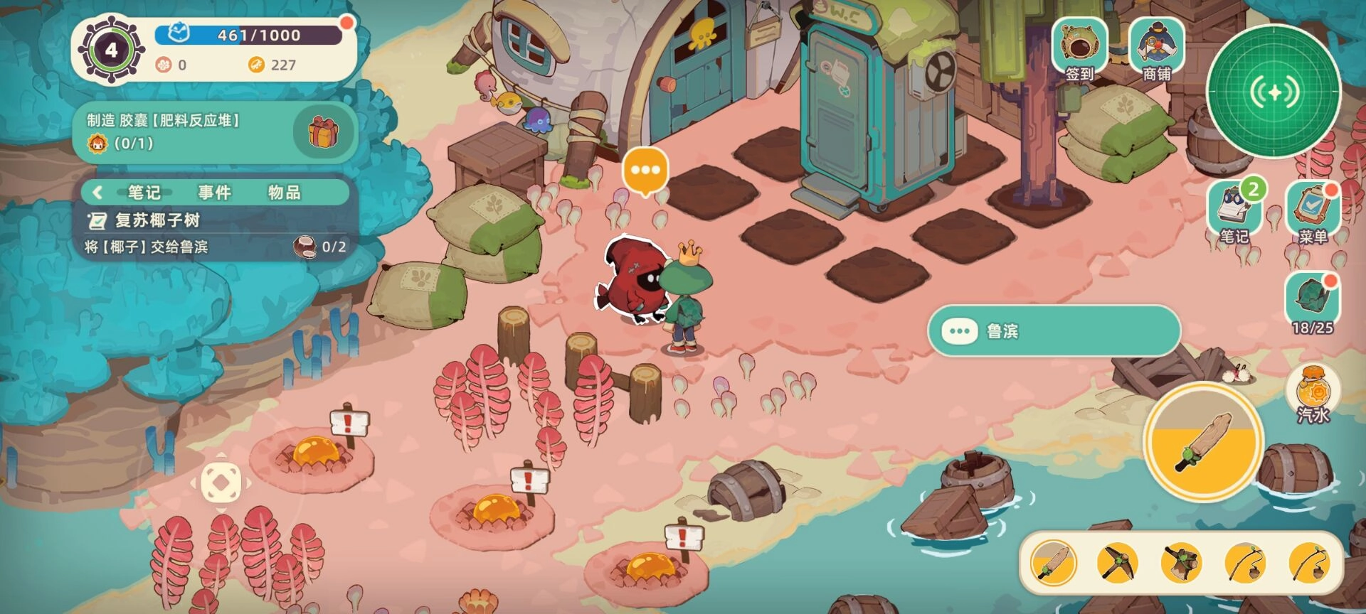 十一,在梦境中的崎岖石滩岛上,砍椰子获取椰子,还进行挖石头的活动。