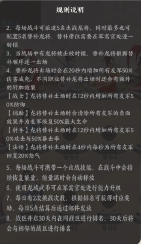 3、当替补龙将出场时,在20秒的时间内,会使所有友军的伤害减免提升50% 。而且,不同职业的替补龙将出场时,还会产生额外的附加效果。