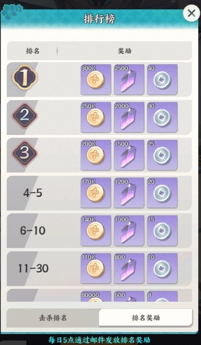 2、根据排名可获得对应奖励,每日5点结算后通过邮件发放