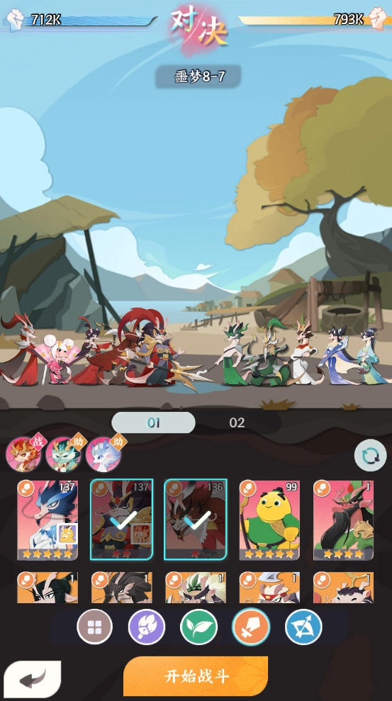 优先选用输出*2 + 辅助*1 + 战士*2这种适用性强的阵容。输出可在法师与射手之间挑选,依据队伍对AOE伤害或单体伤害的需求,以及输出龙将的星级来决定。前期着重考虑龙将的星级与属性,由于养成材料能通过重生无损返还,所以可以先尽可能提升初期龙将的养成程度。