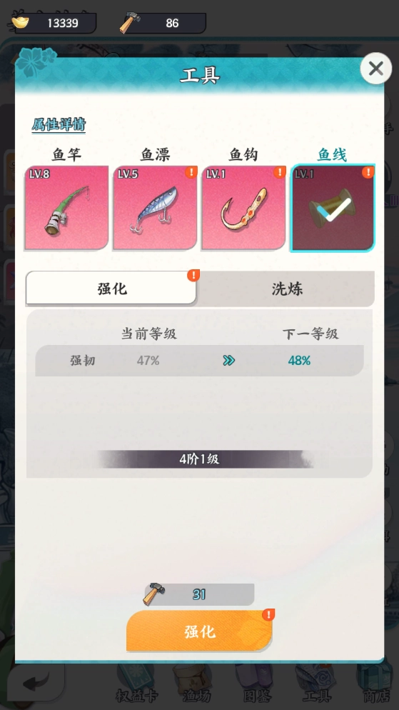 2、渔具升级优先级排序如下:鱼竿(可提升鱼的尺寸以及出售物品所获金额)>鱼漂(能降低鱼逃跑的几率)≈鱼线(可降低鱼线被挣脱的几率)>鱼钩(能够提高鱼饵的属性加成效果)