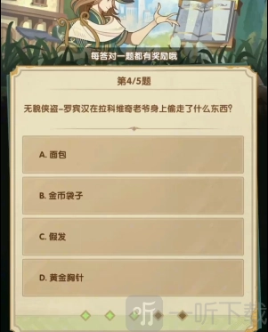 4、无貌侠盗罗宾汉从拉科维奇老爷身上偷走了什么?答案是【黄金胸针】。