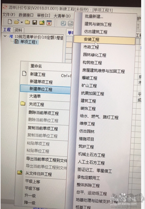 3、在屏幕左侧的空白区域点击鼠标右键,然后选择“新建单位工程”。