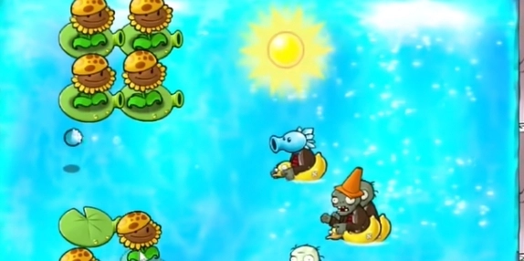 4、于中间偏右侧位置种下一棵水草豌豆,在水池里种上一株寒冰香蒲。