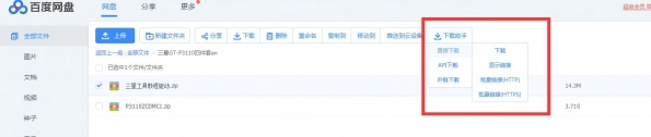 3、安装完成后的效果如下图所示。在百度网盘中选中文件,点击助手按钮,然后选择合适的方法直接下载文件。