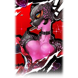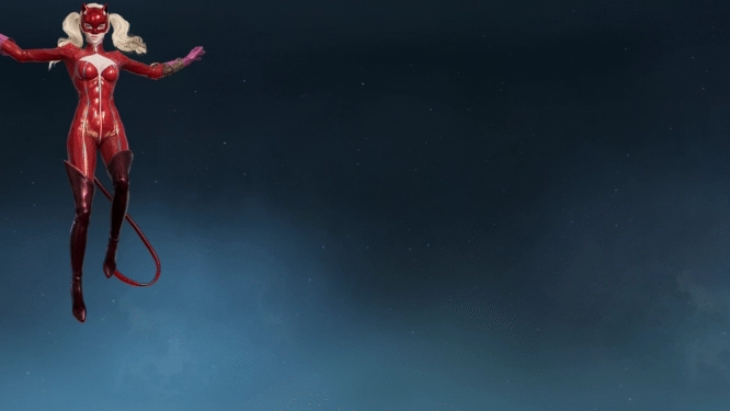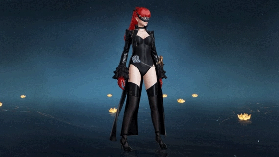一袭以黑色作为主色调的皮制紧身衣,外搭一件带有黑色下摆的夹克,双手戴着红色手套。腰间束着一条链带,其上点缀着一朵银色玫瑰。