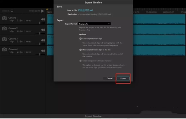 确认没有错误后,我们点击第三个按钮“export timeline(导出到时间线)”,点击该按钮名称就会弹出保存对话框,在对话框中修改名称并选择保存位置,最后点击“export”按钮,就能完成对齐操作。