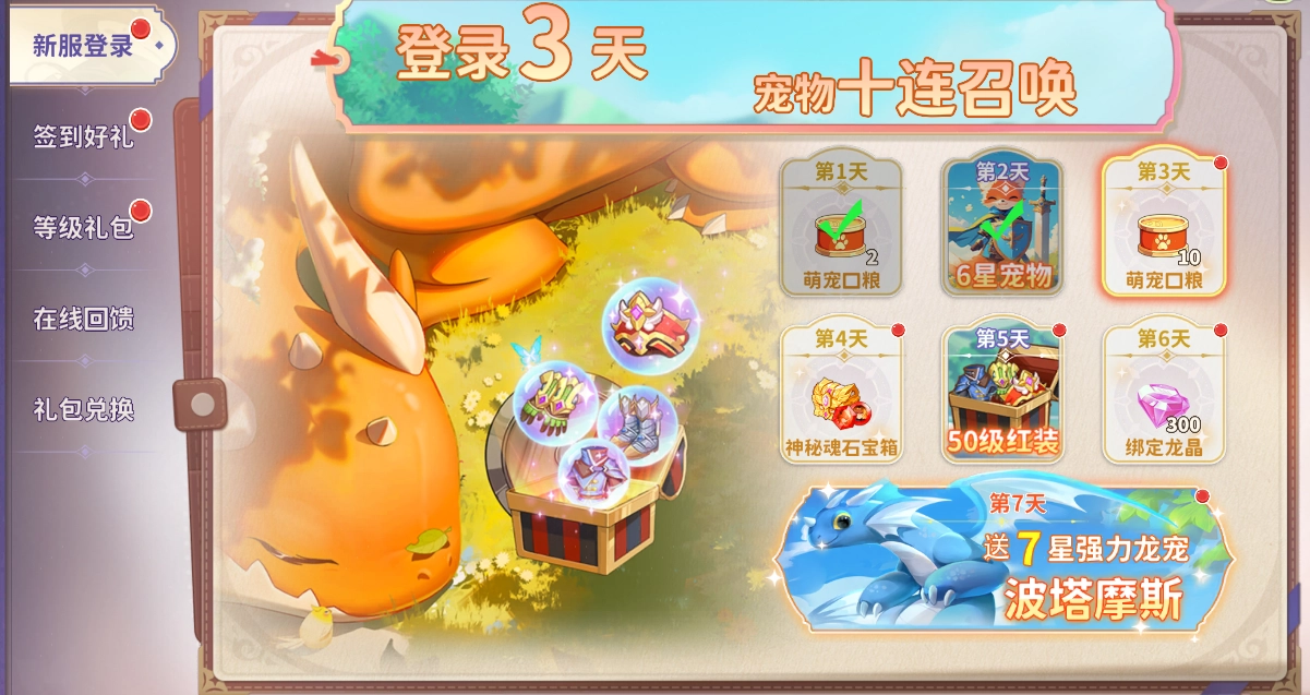 每日坚持登录,丰厚奖励即刻到手!连续登录5天,自选红色装备免费拿!连续登录7天,顶级龙宠水龙波塔摩斯直接送。