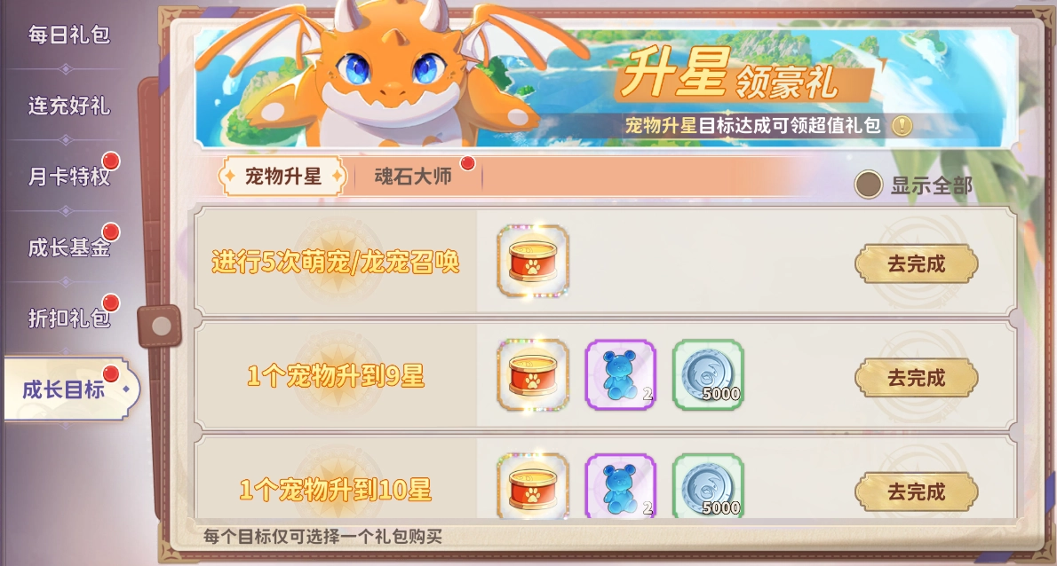 在活动期间,进行宠物升星与魂石镶嵌操作,只要达到相应标准,就能领取海量免费礼包啦。