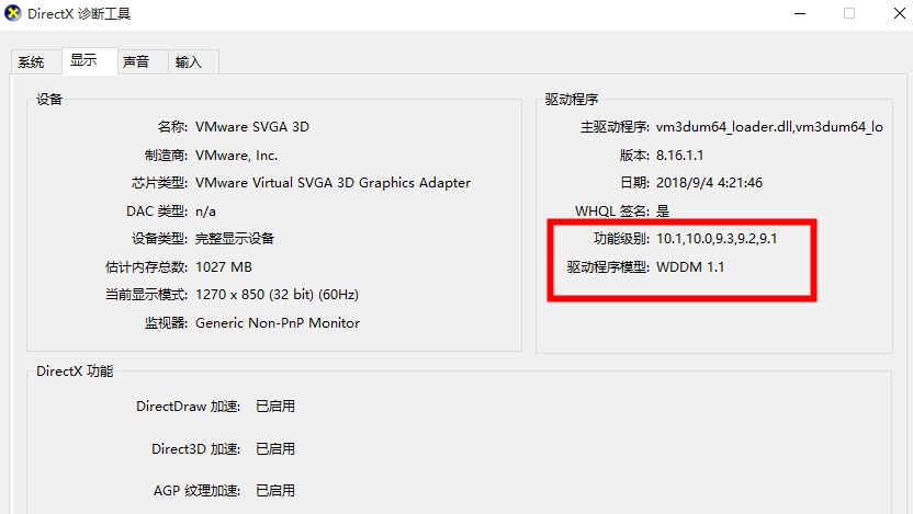 4、完成诊断后,点击上方的“显示”选项卡。若您的显卡支持DX12,在功能级别中会出现12,且下方的驱动程序模型为WDDM2;反之,则表明您的显卡不支持DX12 。