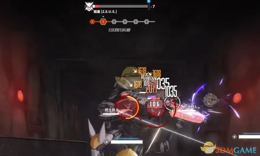 与此同时,两侧的挖土机时不时会射出两发飞弹,这些飞弹会使妮姬眩晕,并造成一定伤害。当战斗进行到第四阶段时,会进入二形态,此后每次会多刷新一个红圈,也就是一次生成三个红圈。并且在红圈被击破后,很快又会出现三个红圈,循环往复无穷无尽。第二阶段仅有两次容错机会。