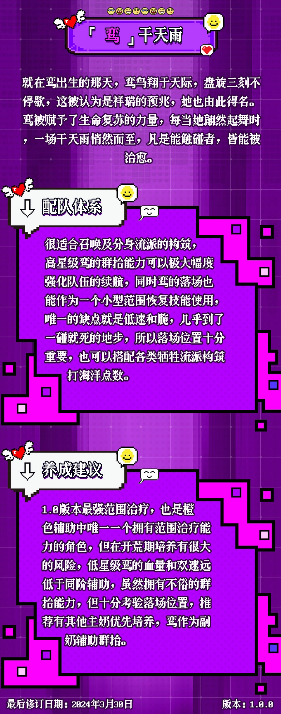 1.0版本中,鸾是最强的范围治疗角色,也是橙色辅助里唯一具备范围治疗能力的。然而,在开荒阶段培养鸾存在较大风险,低星级的鸾,其血量以及双速度远远低于同阶辅助。尽管鸾有着出色的群体治疗能力,可对其入场位置要求很高。建议若有其他主要治疗角色,优先培养,而鸾可作为副奶,辅助群体治疗。