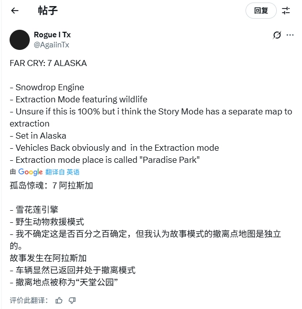 近日,爆料人@AgaiinTx透露,在育碧已停服的游戏《不羁联盟》的文件里,发现了疑似属于《孤岛惊魂7》的场景画面。这些截图呈现的自然景致,似乎与此前关于该游戏将以阿拉斯加为背景的传闻相吻合。