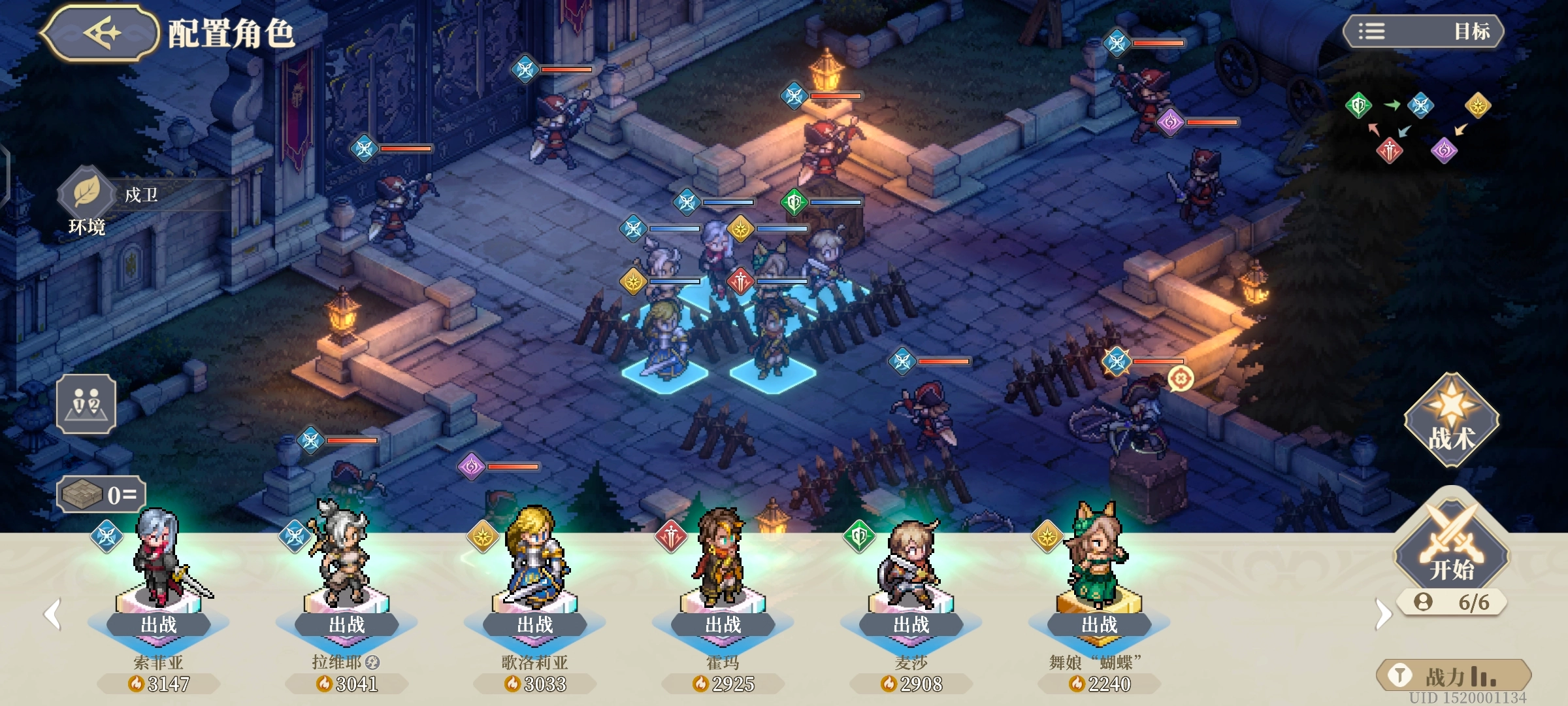 本期个人打法的站位情况如图所示。因队伍中缺少莉拉、泰登以及迪塔利奥,故而很难在一回合内将boss击杀。整体的作战思路为:歌洛负责丢旗子,霍玛则把舞娘前方的拒马拆除。舞娘佩戴笔记,通过加速换位到索菲亚之后开启光环。小姐头戴臂套,与索菲亚协同展开攻击。此处的麦莎,若条件允许,可替换为泰登(要是有泰登或者莉拉那就更为理想)。要是队伍中有莉拉,她能够直接站在霍玛所处位置,把队友拉出来。