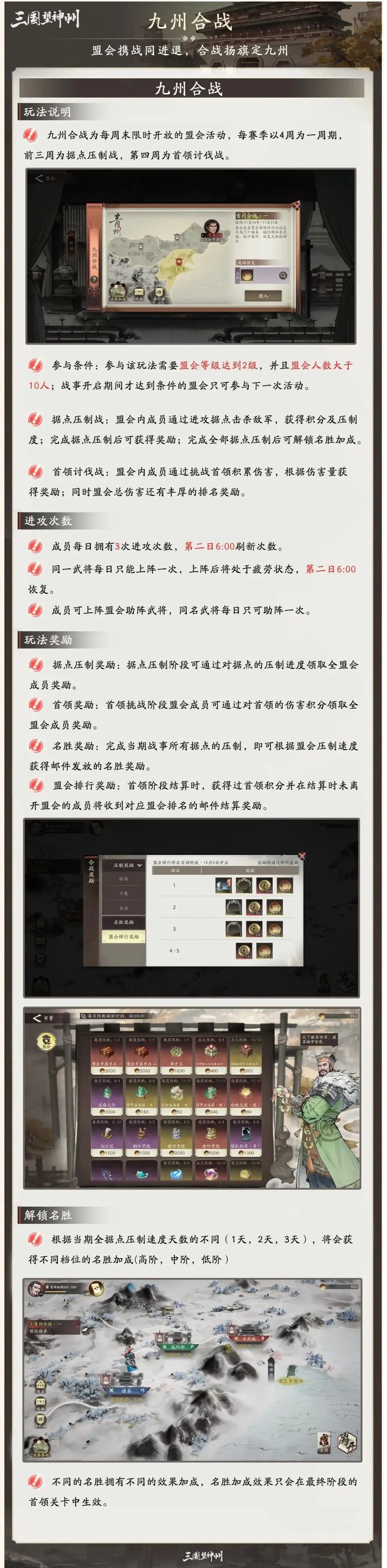 这个玩法是以盟会为单位进行跨服领土争夺的,玩家需要和盟友一起商量制定进攻的路线以及防守的布局。占领据点之后能够得到专属的军功奖励,这些军功可以在盟会商店里兑换高级的授官材料和专属的亲兵宝箱。