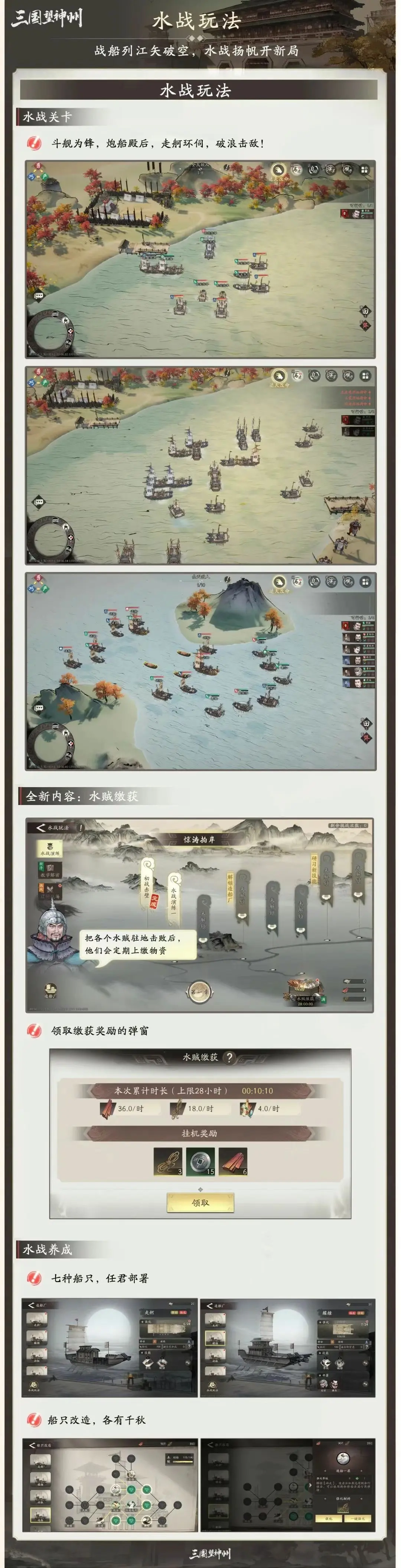 水战玩法里加入了多种功能不同的战船单位,玩家得依据敌方阵型来搭配不一样的船种组合。有的战船在远程火力覆盖方面很擅长,有的则专门精通近身接舷作战,只有合理调配,才能让战力发挥到最大。