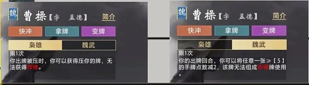 技能效果:当你出牌被压制时,能获取压制你的牌(炸弹除外);在你的出牌回合,可将任意一张点数≥5的手牌点数减少2点。