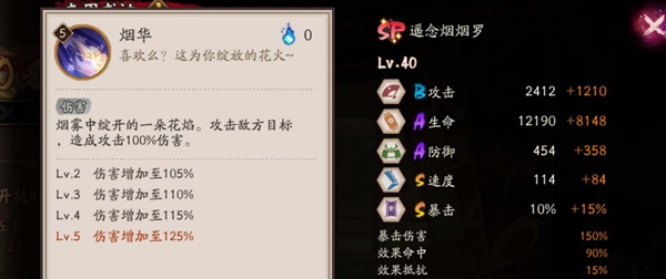 为夜空添上斑斓色彩,绽放花火对敌方全体发动两次攻击,每次造成相当于自身攻击51%的伤害。最终对特定敌方目标造成相当于攻击92%的伤害,并且有50%的基础概率将该特定敌方目标变形为烟之鬼,此变形状态持续1回合。