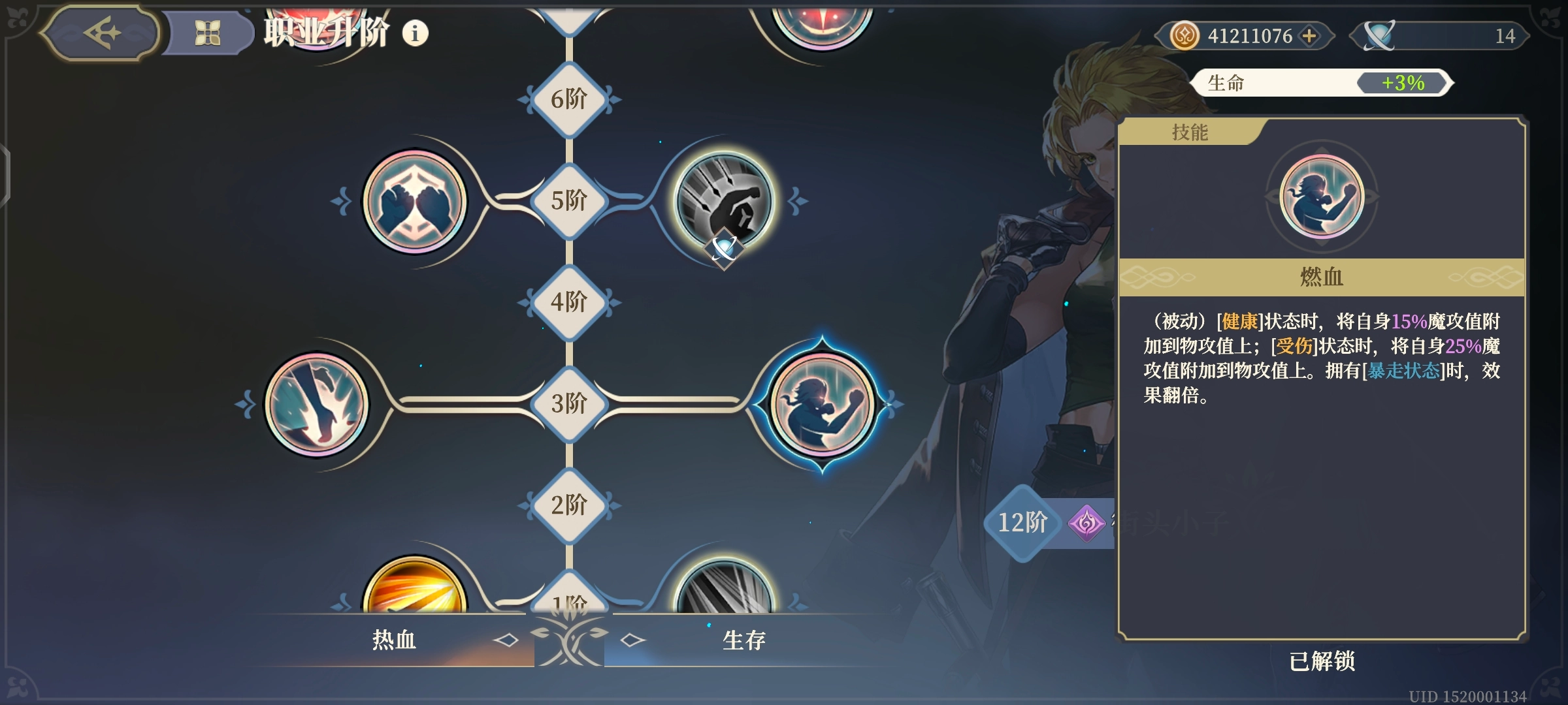 燃血是能提升数值的优质被动,搭配血精石项链这类防具,能达成1+1大于2的效果。在需要通过数值打桩的关卡里,基本是必带的,若是担任主C位,此被动更是必不可少。