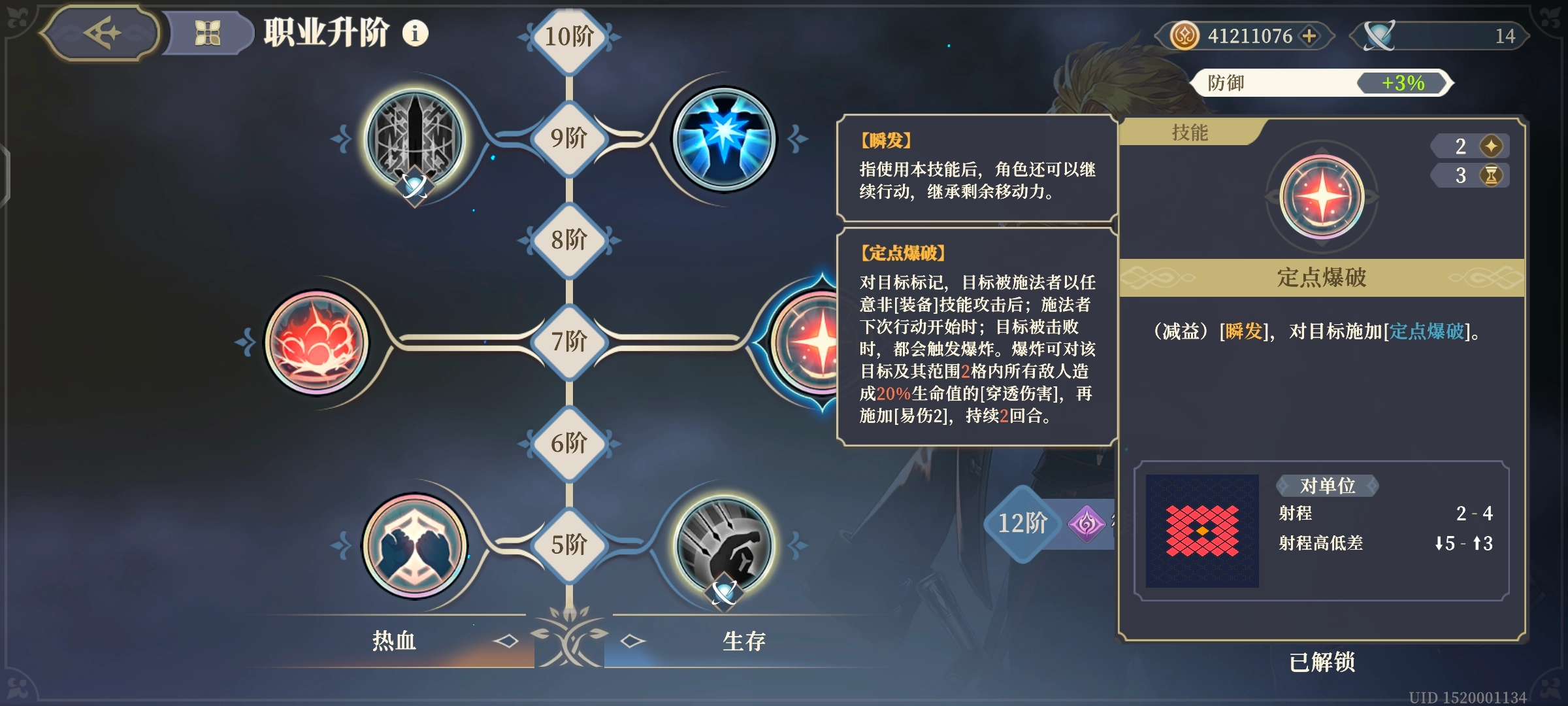 定点爆破属于瞬发标记类技能。当标记目标后,若目标受到非装备技能攻击,或翠斯坦下次行动开始,又或者标记目标被击败,均会触发爆炸,对二格范围内的敌军造成相当于其20%生命值的穿透伤害,同时给标记目标施加易伤2。通常,该技能用于清理小怪以及施加易伤,是一种对策技能。