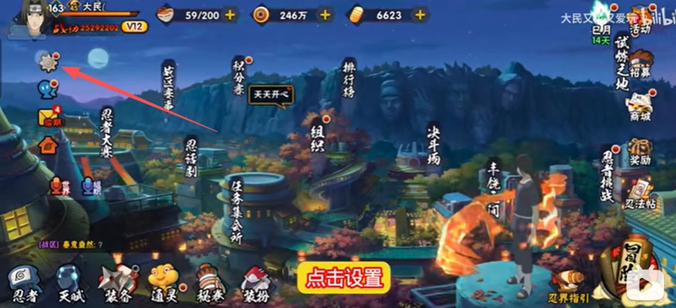 1、打开火影忍者手游,找到并点击设置选项