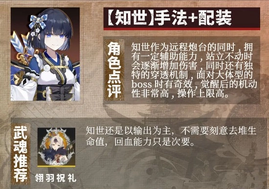 知世处于站立状态时,伤害会持续叠加。面对大型boss时,她还具备独特的穿透机制,能让输出效率达到顶峰。关于武魂选择,首先要明确这个角色的定位是输出,所以没必要堆生命值属性。回血能力相对次要,优先拉满输出属性才是关键,因此建议直接选择翎羽祝礼武魂,这样可以有效提升伤害数值。
