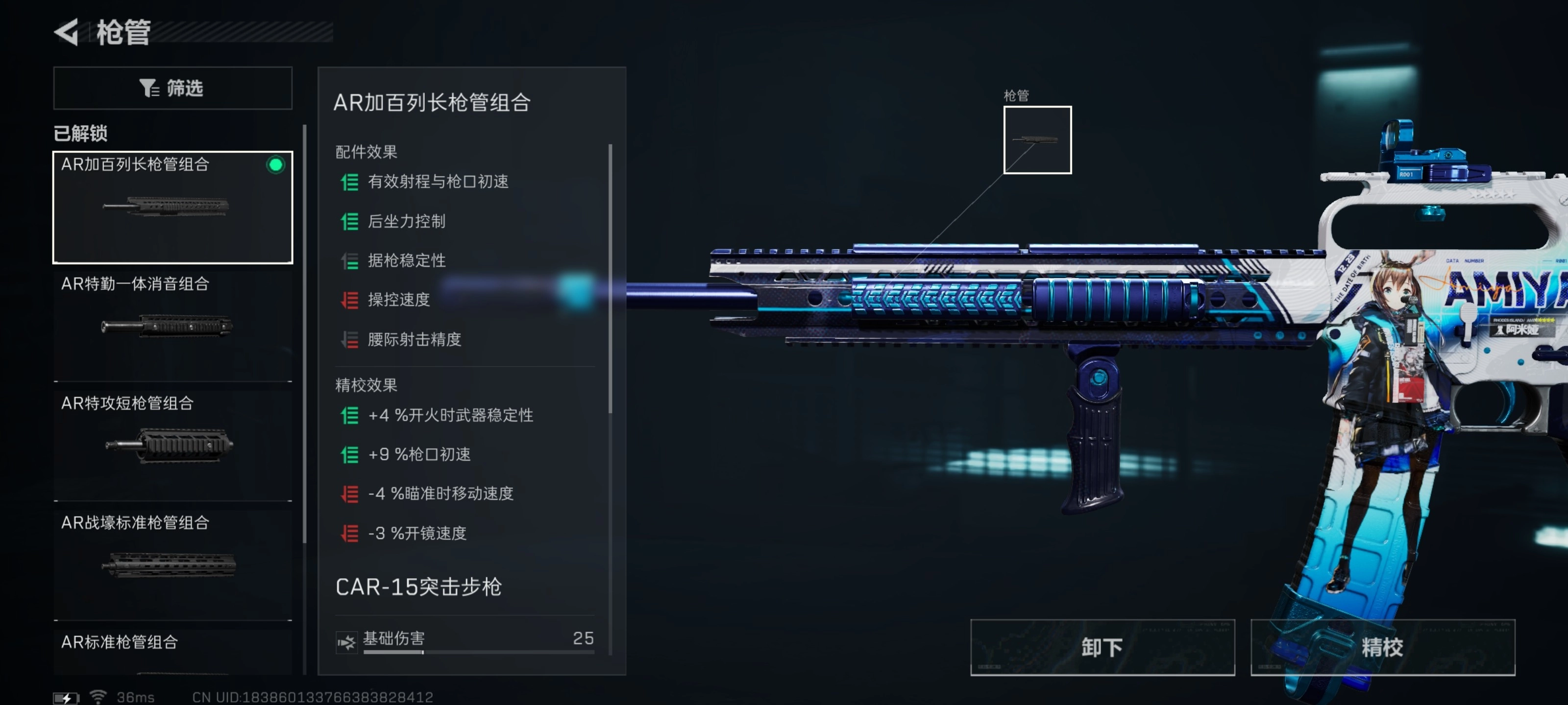 枪管选用AR加百利长枪管组合。该组合在增加5米射程的同时,还能提升枪械稳定性,从而让对枪胜率更具优势。
