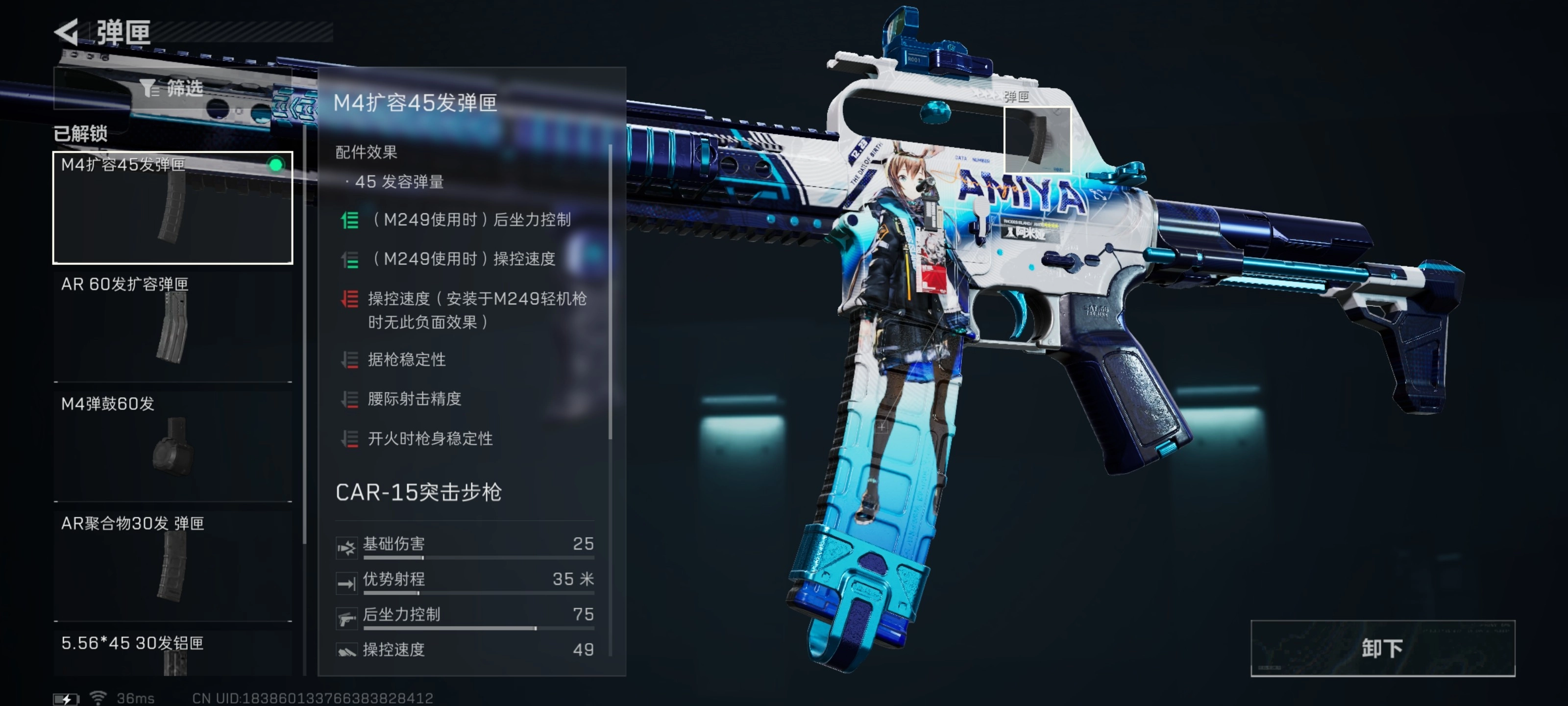 弹夹选择M4扩容45发弹匣。增加子弹数量提升若错率。