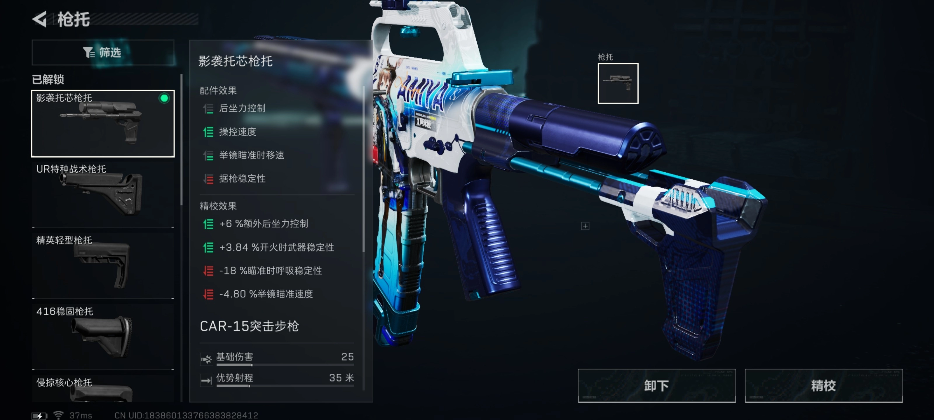 我选的是影袭托芯枪托,搭配折叠握把这个前握把,能抵消其他配件对操控速度造成的大幅负面效果,还能显著提升操控速度。