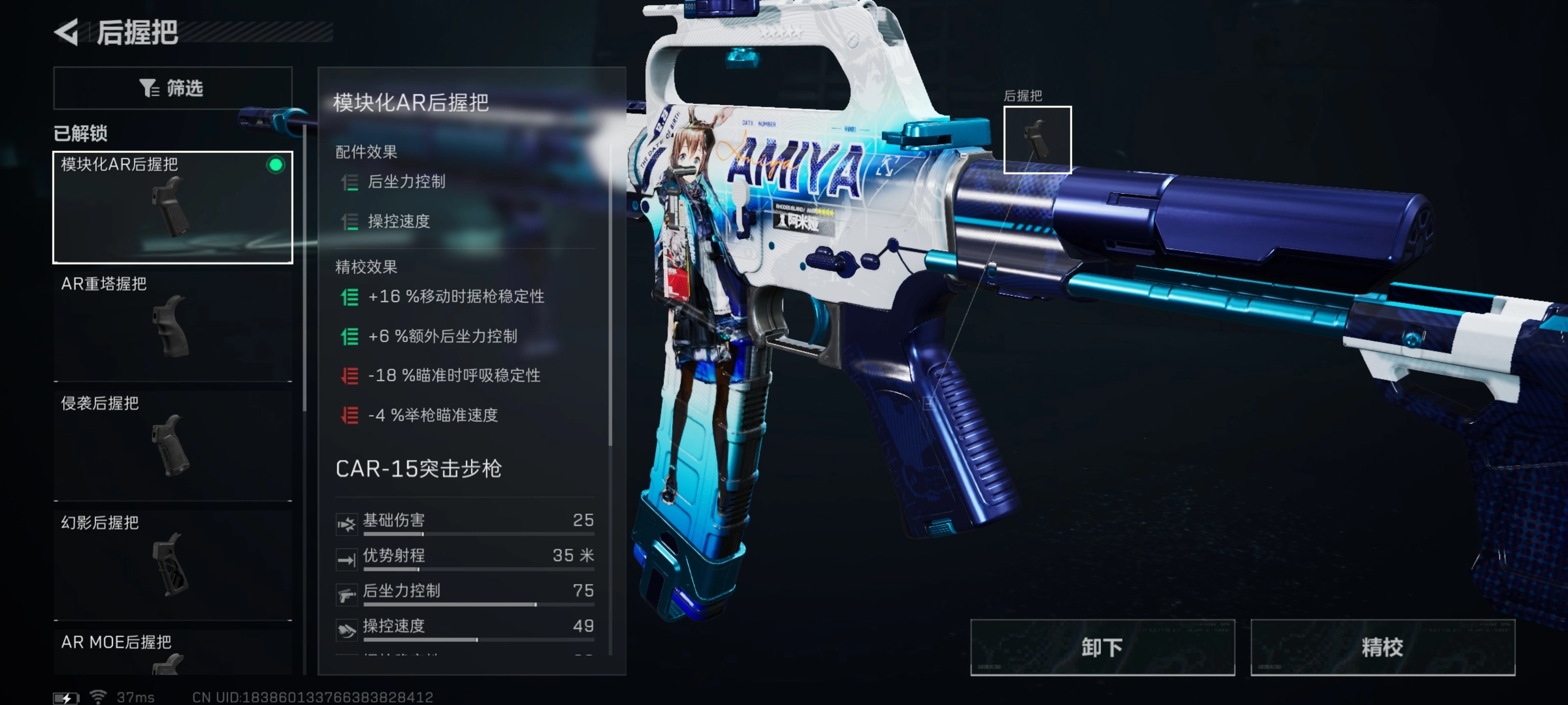 后握把我选用模块化AR后握把,搭配AR重型握把片,以此增强握持稳定性,进而提升对枪时的获胜几率。
