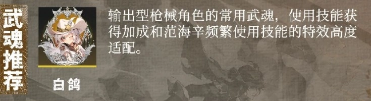 目前给范海辛搭配武魂时,比较推荐的选择是白鸽。作为当前输出型家具角色的最优武魂搭配之一,白鸽与范海辛组合能触发专属加成效果——不仅能提升范海辛的技能释放频次,其后期特效高度也与范海辛的特性适配度较高。因此,若大家拥有白鸽武魂,建议优先将其与范海辛搭配使用。
