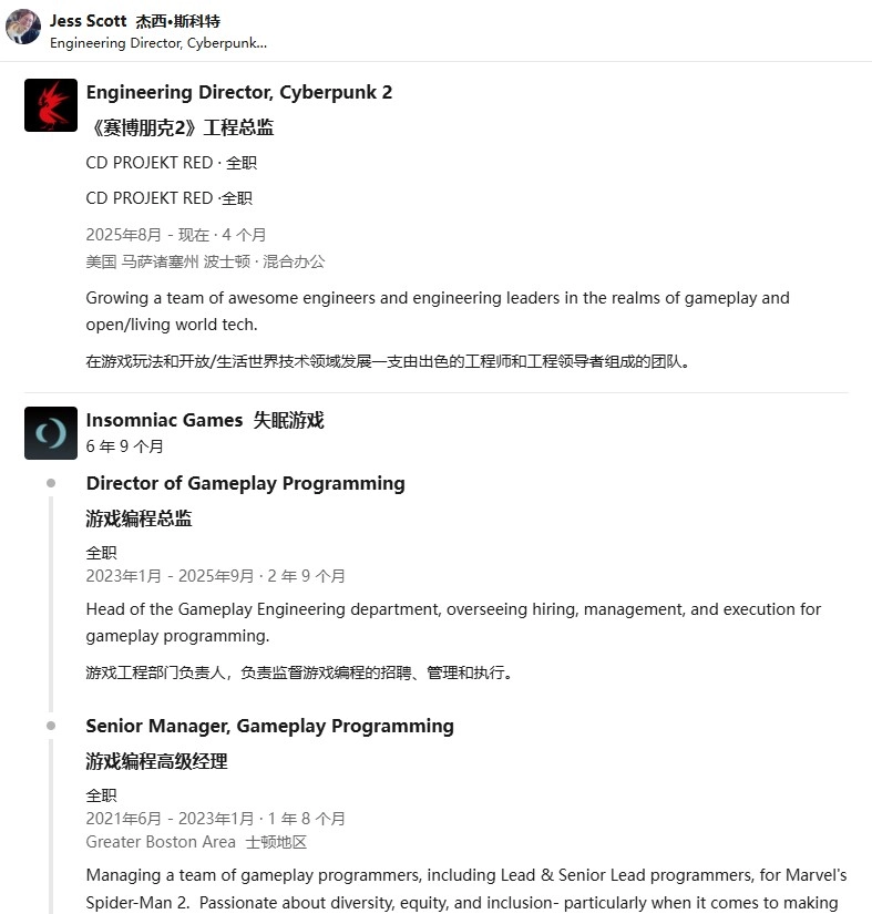 根据其最新更新的领英档案显示,这位曾主导《漫威蜘蛛侠2》与《瑞奇与叮当:时空跳转》核心玩法系统的资深开发者,已于2025年8月起担任CDPR工程总监,负责组建并领导专注于开放世界构建、动态环境技术与玩法系统的工程师团队——这些正是开发(代号“猎户计划”)的《赛博朋克2》最关键的技术支柱。