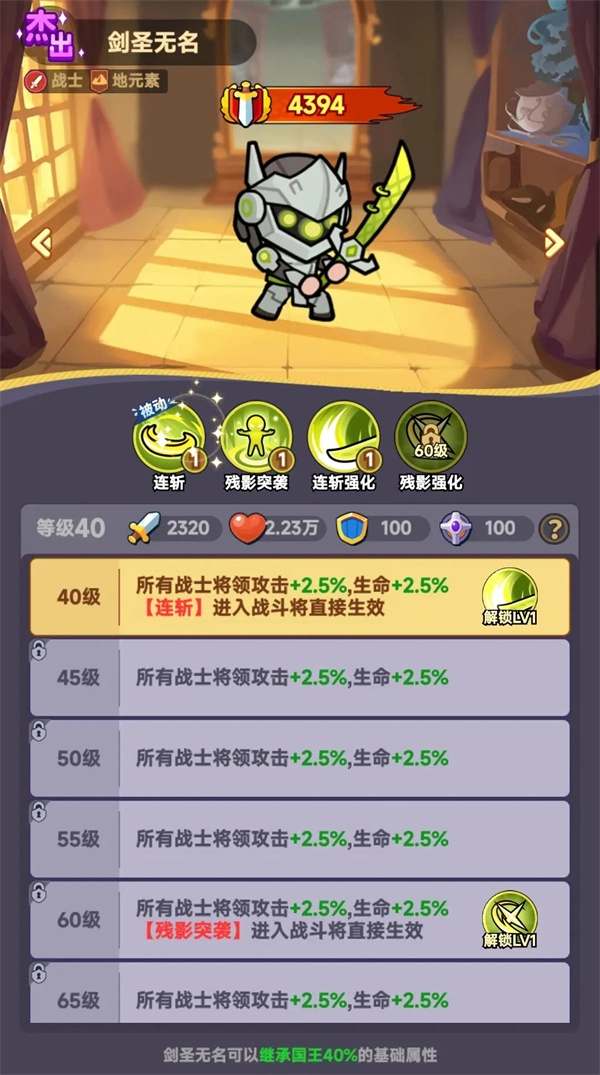 一二技能皆为次数型范围攻击伤害,无论是前期还是中期,都会出现大量脆皮小怪。要是运气不错,剑圣无名等级高于凯伦,便可以选用他一路打到15关。后续解锁的新玩法同样需要他,属于杰出中品。