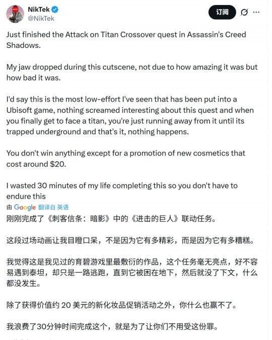 《刺客信条:影》已于今年3月正式发售,截至目前,该游戏在Steam平台上的评价为“多半好评”。