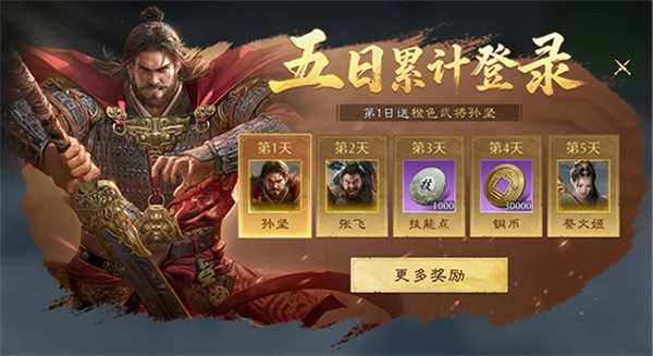 1、公测开启后,只要累计登录满5天,就能免费领取4位传说品质的橙色武将,分别是武力型武将「孙策」、防御型武将「孙坚」、武力型武将「张飞」以及治疗型武将「蔡文姬」。