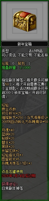 2026年1月1日起,参与活动即可获取【新年宝箱】,借助【金钥匙】开启该宝箱后,必然能得到大量璀璨脉气、月魂、可交易材料,还有机会获得兵魄洗炼石等珍稀道具。