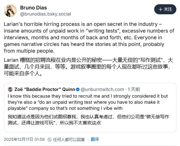因《伦敦陷落》而为人熟知的电子游戏编剧布鲁诺·迪亚斯,便是其中一位发声者。他在社交平台上表示:“拉瑞安那套糟糕的招聘流程,在行业内早已是公开的秘密。他们所谓的‘写作测试’,掺杂着大量无偿劳动,还有多轮面试以及长达数月的反复沟通拉扯……如今游戏叙事领域的从业者几乎都听过这些情况,甚至很可能从不同人那里多次听闻。”