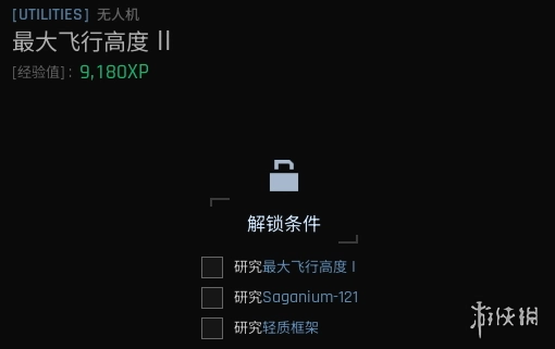解锁条件:完成最大飞行高度I研究、完成Saganium-121研究、完成轻质框架研究,以及进行约12小时的样本分析