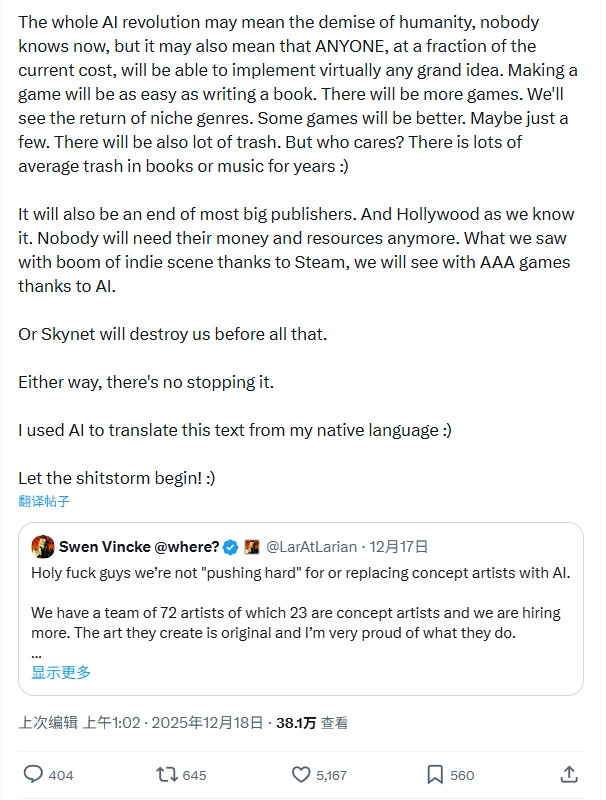 “这也将终结大多数大型发行商,以及我们熟悉的好莱坞。没人再需要他们的钱和资源。就像Steam推动了独立游戏浪潮一样,AI将推动3A游戏的独立化。”