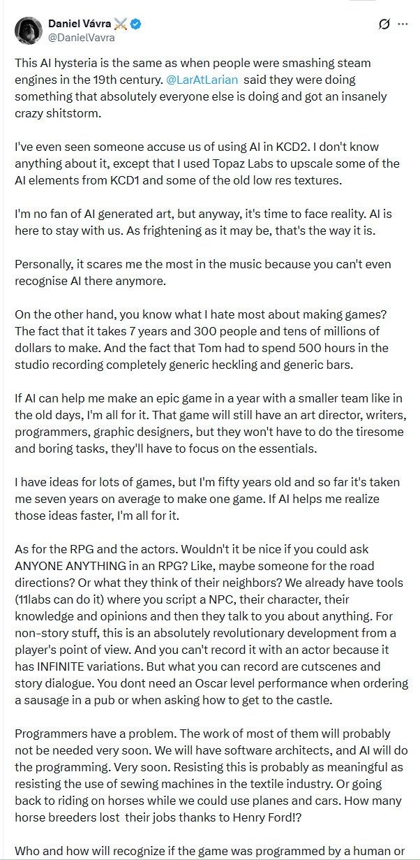 随后,《天国:拯救》系列总监、Warhorse Studios联合创始人Daniel Vávra在X平台上公开支持拉瑞安工作室,他表示如今几乎所有游戏工作室都在进行类似的尝试。Daniel Vávra坦言AI技术确实存在不少负面争议,但他认为人们需要认清一个事实:AI并不会被淘汰,大家只能学会适应并合理利用它。