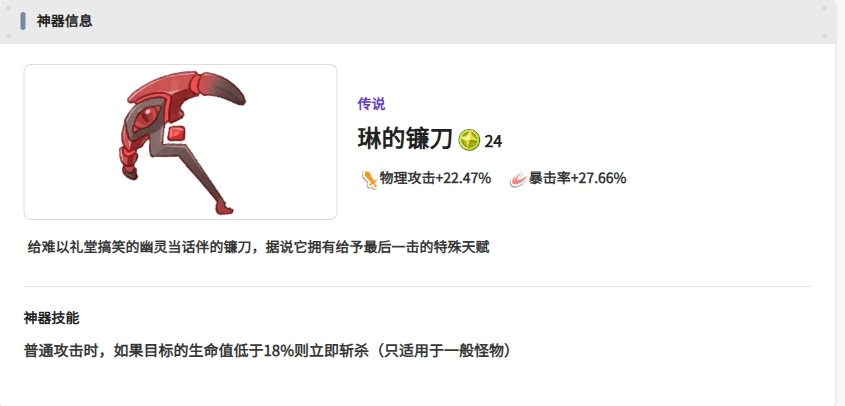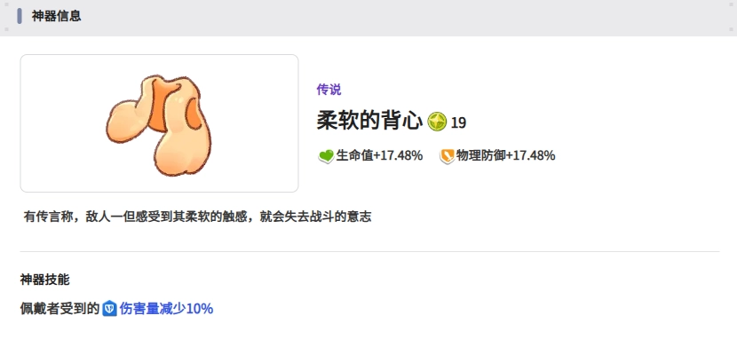 - 效果:提升生命值与暴击抵抗能力;当血量低于或等于30%时,会触发恢复效果(该效果触发需处于神器持续生效期间)。
