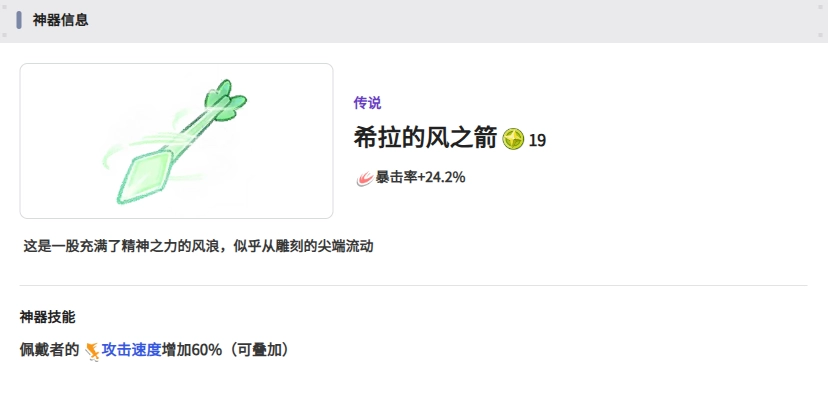 - 效果:仅限风属性角色使用,可提供60%的攻击速度加成,和暴击流派的适配度极高。