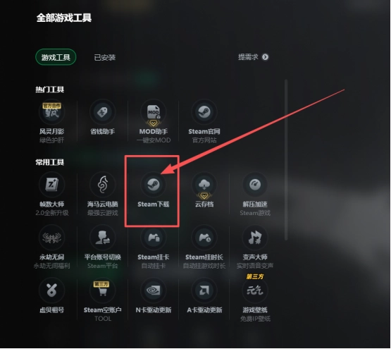 在迅游加速器的Steam加速页面,点击工具栏里的“全部工具”,找到并点击“Steam下载”工具,选定安装路径就能启动下载。这种方式可以绕开访问官网时可能碰到的加载异常问题。