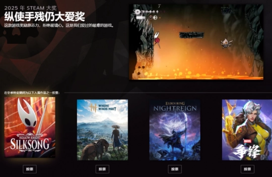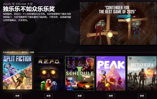 今日,Steam正式开启2025年度Steam大奖的玩家投票通道,同时公布了全部11个奖项的提名游戏名单,最终获奖作品将由全球玩家社区投票选出。投票时间将延续至Steam冬季促销活动落幕,获奖结果定于2026年1月4日公布,赶紧来投出你心中的年度佳作吧!