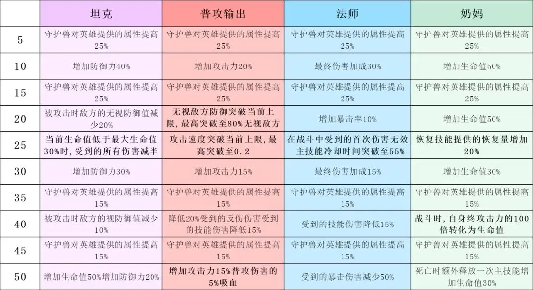 对于坦克职业而言,25级解锁的“血量低于30%时获得高额伤害减免”技能堪称绝对的质变点,性价比极高,理应成为全队最优先达成的目标。法师职业的核心技能同样出现在25级,其效果为“免疫首次致命伤害”或“大幅缩减技能冷却”,能够显著提升生存能力与爆发频率。普攻型输出英雄的关键技能分布在20级、25级和50级,分别对应破甲强化、攻速强化与吸血强化,属于长期投资类型。奶妈的核心技能则位于25级和40级,主要作用是大幅提升治疗量以及根据攻击力附加治疗效果。