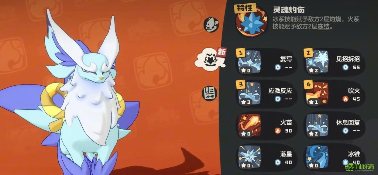 再来瞧瞧它的特性,“灵魂灼烧”这个特性确实很有意思。使用冰系技能攻击对手时,会给对方叠加灼烧效果;而使用火系技能时,又能叠加冰冻效果。这种交叉叠加的机制,让尖嘴狐仙的持续输出能力变得十分强劲。敌人身上的负面状态越多,受到的伤害自然也就越高,战斗起来会越来越轻松。