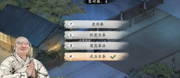 2. 到达目的地之后,接着与和尚展开交流,并准确解答四道题目。