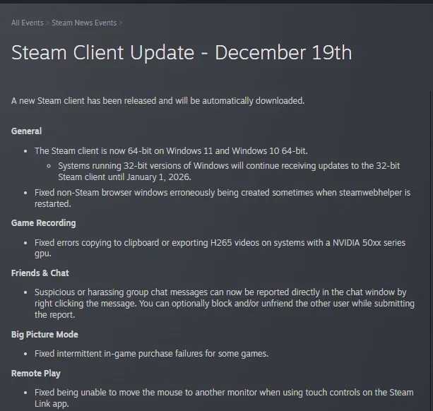玩家需要留意的是,这次调整仅涉及Steam客户端程序本身。Steam商店里的32位游戏在64位操作系统上依旧能正常运行,不会受到影响。这样做是为了优化大部分用户的使用体验,同时促进整个PC游戏生态朝着更先进的64位标准发展。