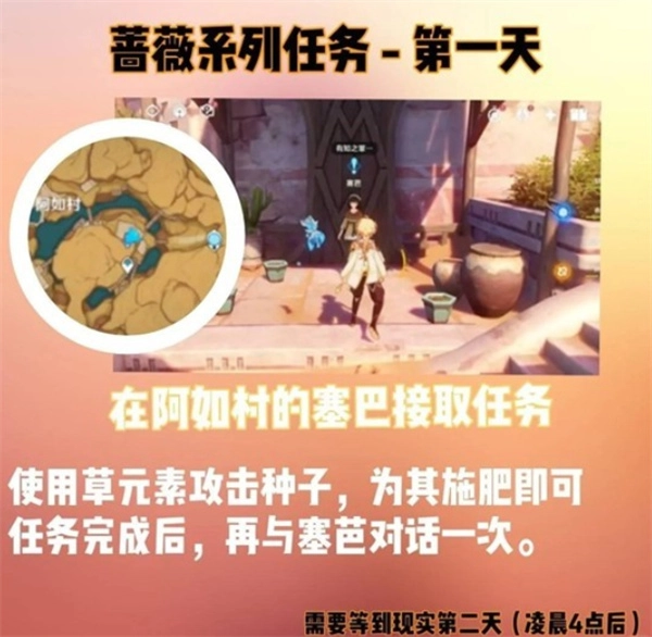 和赛芭进行对话,提交一朵须弥蔷薇,得到种子后用草元素来施肥