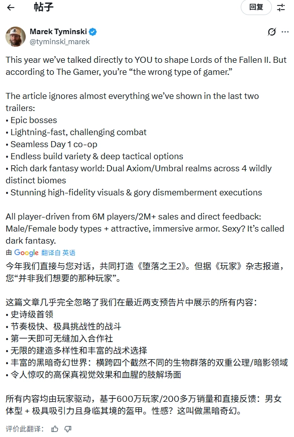 文中指出,《堕落之主》的首席执行官Marek Tyminski此前在推特上发布消息,表明《堕落之主2》会“依据真实玩家的反馈来打造”,这一点在近期的两条预告片中也得到了清晰体现。当有用户询问游戏是否会设计具有吸引力的女性角色时,他简洁地回应“会”,这一回答同样明确地揭示了《堕落之主2》所面向的玩家群体。